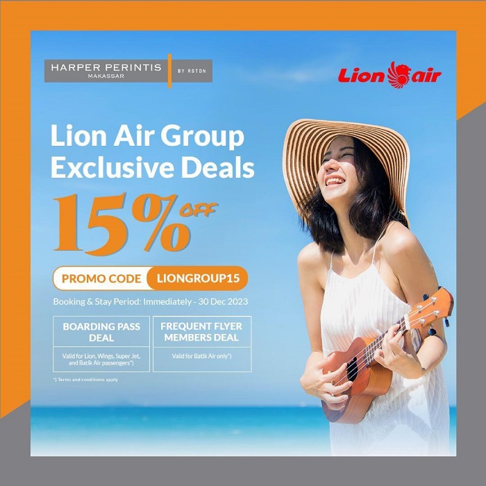 INFOKINI.ID, MAKASSAR – Kabar gembira bagi para penumpang Lion Air Group. Hotel Harper Perintis Makassar by ASTON bekerja sama dengan Lion Air Group memberikan penawaran spesial bagi Anda yang memilih Hotel Harper Perintis Makassar by ASTON sebagai tujuan check in Anda yaitu potongan harga kamar sebesar 15 persen.