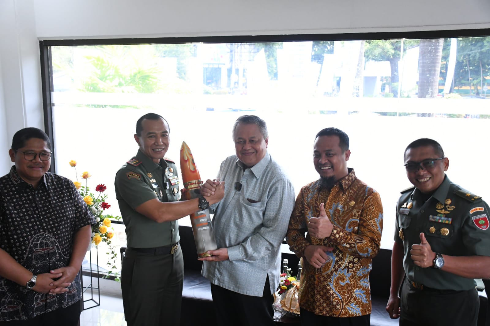 Pangdam XIV/Hasanuddin Mayjen TNI Totok Imam Santoso menyerahkan cinderamata kepada Gubernur Bank Indonesia Perry Warjiyo, sebagai kenang-kenangan, disaksikan Gubernur Sulsel Andi Sudirman Sulaiman.(Foto:ist)