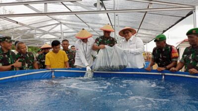 Penebaran benih ikan nila dengan sistem bioflok yang dilakukan di lahan milik Kodam Hasanuddin di Kelurahan Tamarunang, Kabupaten Gowa. Kerjasama ini merupakan sinergitas Kodam dan Bank Indonesia, dalam menghadapi inflasi pangan. (foto:dok)