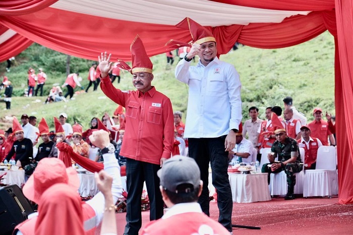 Bupati Gowa yang juga Ketua PMI Sulsel Adnan Purichta Ichsan dan Wakil Bupati Gowa yang juga Ketua PMI Gowa Abd Rauf Malaganni saat pelaksanaan Jumpa Bakti dan Gembira (Jumbara) PMR IX Palang Merah Indonesia (PMI) Provinsi Sulawesi Selatan di Lapangan Hutan Pinus Malino, Kecamatan Tinggimoncong, Kabupaten Gowa, Sabtu (13/5/2023). ()