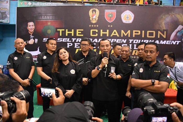Pangdam XIV/Hasanuddin Mayjen TNI Dr. Totok Imam Santoso, S.I.P., S.Sos., M.Tr. (Han) saat penutupan The Champion Sulseltrabar Open Tournament Pencak Silat, yang memperebutkan Piala Kasad (Kepala Staf Angkata Darat) Tahun 2023, di GOR Sudiang Kota Makassar, Minggu (21/5/2023).