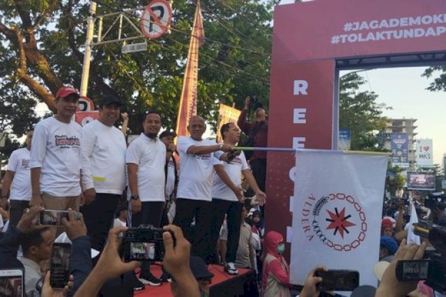 INFOKINI.ID, MAKASSAR – Aktivis 98 yang tergabung dalam Aliansi Demokrasi Rakyat (Aldera) di Kota Makassar, Sulawesi Selatan (Sulsel) menggelar jalan sehat memperingati 25 tahun reformasi di Anjungan Pantai Losari Makassar. Gerak jalan sehat ini diinisiasi Yayasan Anak Rakyat Indonesia.