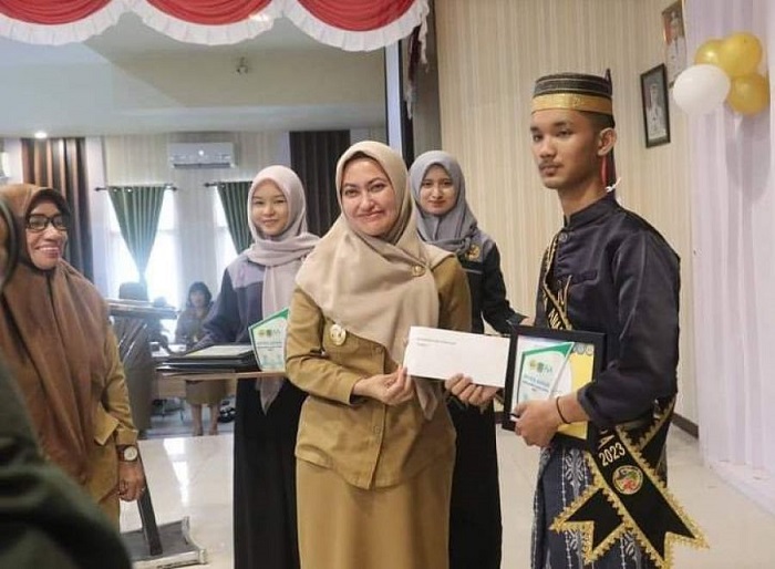 Bupati Luwu Utara Indah Putri Indriani menyematkan penghargaan kepada Irghy sebagai Duta Anak 2023.