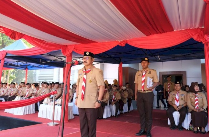 Wakil Bupati Gowa selaku Wakil Ketua Majelis Pembimbing Cabang (Mabicab) Gerakan Pramuka Gowa, Abd Rauf Malaganni menjadi Pembina Apel Besar Gerakan Pramuka Ke-62 Tahun Tingkat Kwartir Cabang (Kwarcab) Gowa yang berlangsung di Lapangan Upacara Kantor Bupati Gowa, Senin (28/8/2023).