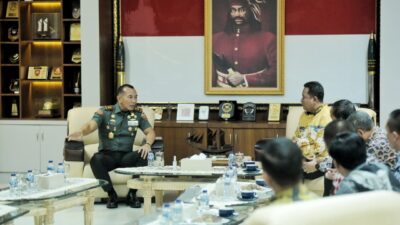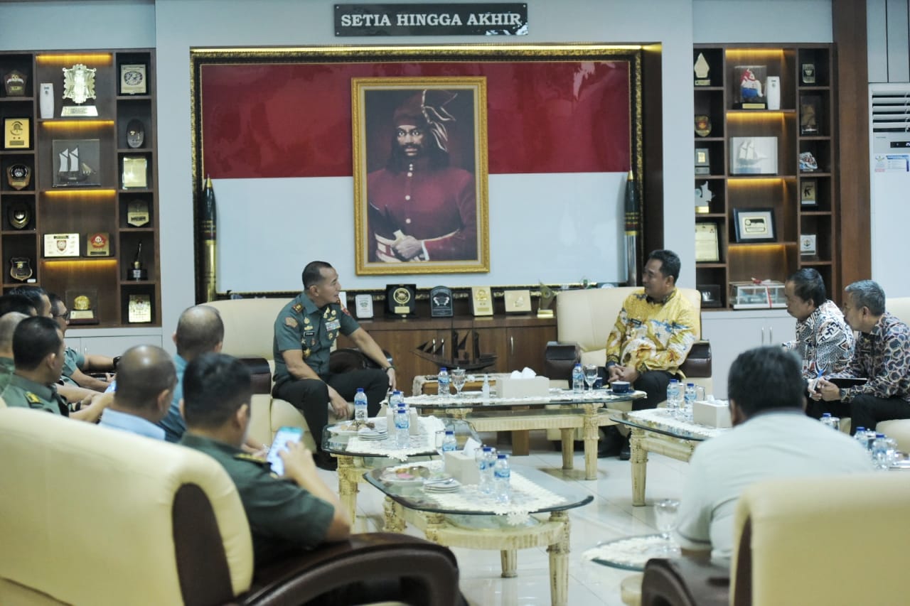 Pangdam XIV/Hasanuddin Mayjen TNI Dr. Totok Imam Santoso, S.I.P., S.Sos., M.Tr (Han)., menerima kunjungan silaturahmi Pejabat (Pj) Gubernur Sulsel Dr. Bahtiar Baharuddin, M.Si., di Makodam Hasanuddin, Kamis (7/9/2023).(foto:ist)