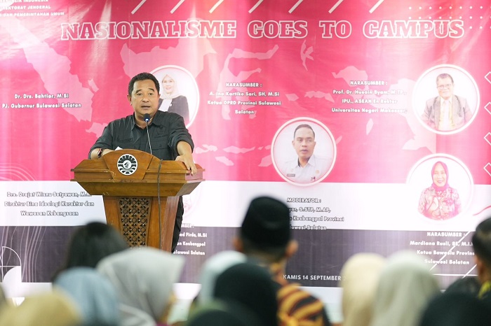 INFOKINI.ID, MAKASSAR – Penjabat Gubernur Sulawesi Selatan (Sulsel), Bahtiar Baharuddin, memberikan kuliah umum mengenai wawasan kebangsaan dan penguatan ideologi Pancasila, di hadapan mahasiswa Universitas Negeri (UNM) dan Panwaslu kabupaten/kota se-Sulsel, Kamis, 14 September 2023.