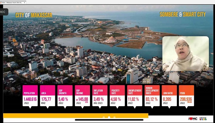 Mewakili Danny Pomanto, Plt. Kepala Dinas Komunikasi dan Informatika (Diskominfo) Kota Makassar, Ismawaty Nur memaparkan visi-misi Makassar Sombere’ & Smart City. Berlangsung melalui zoom meeting, Kamis (21/9/2023).