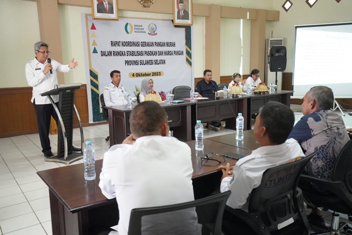 INFOKINI.ID, MAKASSAR – Penjabat Sekertaris Daerah Provinsi Sulawesi Selatan Andi Muhammad Arsjad membuka Rapat Koordinasi Gerakan Pangan Murah Dalam Rangka Stabilisasi Pasokan dan Harga Pangan Provinsi Sulawesi Selatan yang digelar di Aula Kantor Dinas Ketahanan Pangan Provinsi Sulawesi Selatan, di Makassar, Rabu 4 Oktober 2023.