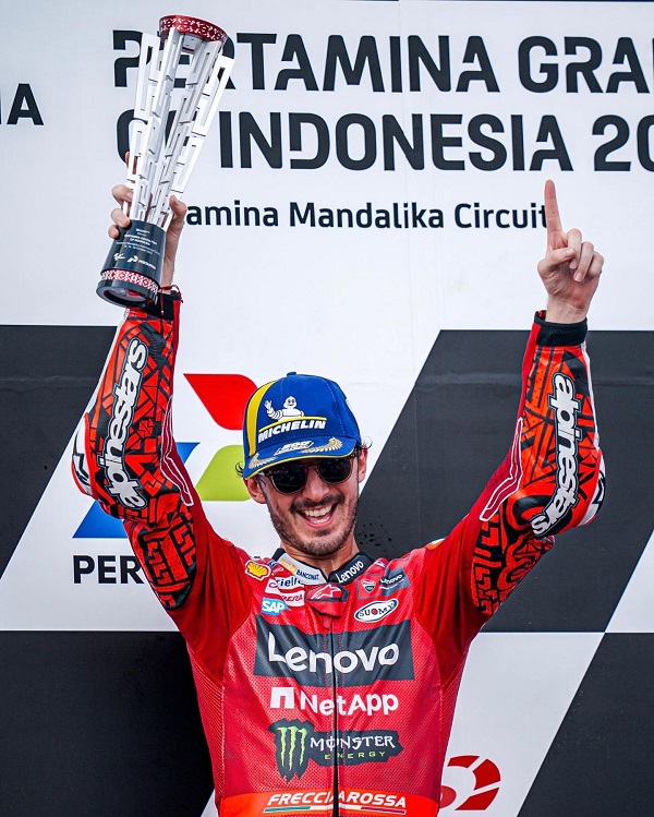 INFOKINI.ID, LOMBOK TENGAH – Pembalap Ducati Lenovo Francesco Bagnaia berjaya di MotoGP Mandalika. Ia berhasil menang dramatis di balapan utama MotoGP yang digelar di Sirkuit Internasional Mandalika, Lombok Tengah, NTB, Minggu (15/10/2023).