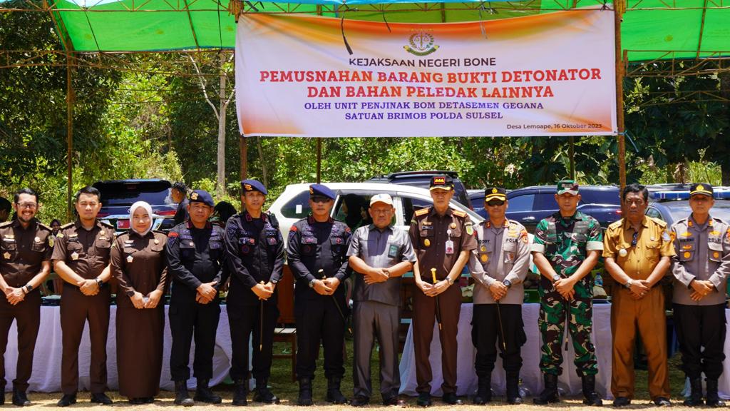 INFOKINI.ID, BONE – Kejaksaan Negeri (Kejari) Bone melakukan pemusnahan bahan bukti kejahatan berupa detonator di Lapangan Tembak Korem 141 Toddopuli, Desa Lemoape, Kecamatan Palakka, Kabupaten Bone, Senin (16/10/2023). Pemusnahan melibatkan Detasemen Gegana Brimob Polda Sulsel.