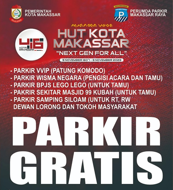 INFOKINI.ID, MAKASSAR – PD Parkir Makassar Raya menyiapkan lima kantong parkir gratis bagi masyarakat dan tamu yang akan menyaksikan puncak Peringatan HUT Kota Makassar ke-416, Kamis (2/11/2023).