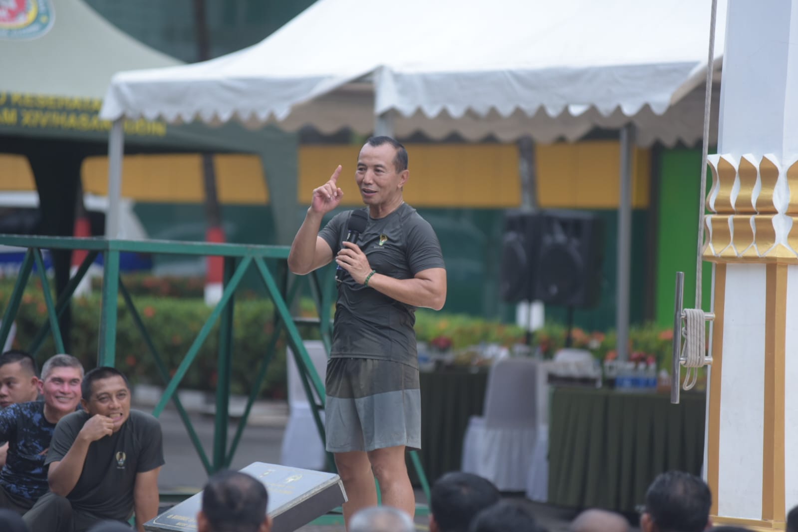 INFOKINI.ID, MAKASSAR– Olahraga bersama menjadi salah satu upaya menjalin silaturrahmi dan kekompakan yang dirutinkan Pangdam XIV/Hasanuddin Mayjen TNI Totok Imam Santoso. Dikenal sebagai jenderal bintang dua yang memassifkan dan menggaungkan olahraga sejak menjabat orang nomor satu di Kodam Hasanuddin, mantan Gubernur Akmil ini juga kerap merangkaikan kegiatan olah tubuh ini dengan pengarahan dan memotivasi prajurit Hasanuddin. Seperti yang dilakukannya saat olahraga bersama PJU Kodam Hasanuddin, personel Kesdam XIV/Hasanuddin dan Rumah Sakit TK II Pelamonia di Lapangan RS Pelamonia Makassar, Jumat (24/11/2023).
