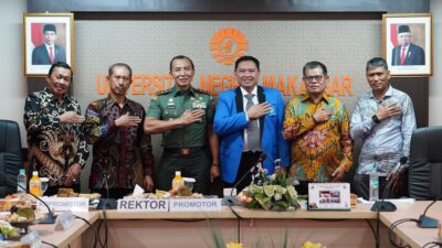 INFOKINI.ID, MAKASSAR– Pangdam XIV/Hasanuddin Mayjen TNI Dr. Totok Imam Santoso, S.I.P., S.Sos., M.Tr. (Han) didaulat menjadi penguji eksternal dalam ujian Disertasi Program Doktor (S3) di ruang lantai 7 Gedung Phinisi Universitas Negeri Makassar (UNM), Jumat (24/11/2023).