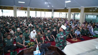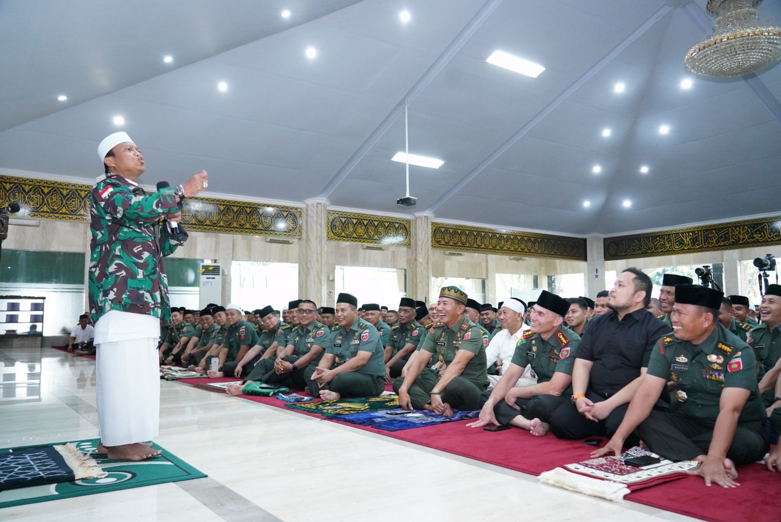 INFOKINI.ID, MAKASSAR– Dalam rangka menyambut Hari Juang TNI AD ke-78, seluruh prajurit, Aparatur Sipil Negara (ASN) Kodam XIV/Hasanuddin serta Persit mengikuti doa bersama dan ceramah agama yang dipimpin dan disampaikan Da’i kondang Ustad Das’ad Latif, di Masjid Sultan Hasanuddin, Makodam, Selasa (12/12/2024). Kehadiran Ustad Das’ad Latif yang lekat dengan ciri dialek khas Bugis ini diinisiasi langsung Pangdam XIV/Hasanuddin Mayjen TNI Totok Imam Santoso sebagai upaya memberikan pencerahan, siraman rohani serta untuk menambah pengetahuan keagamaan kepada warga Kodam XIV/Hasanuddin.