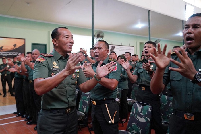 Setibanya di Aula Antasena, Pangdam Hasanuddin disambut dengan nyanyian yel-yel dengan semangat membara oleh personel Bekangdam.