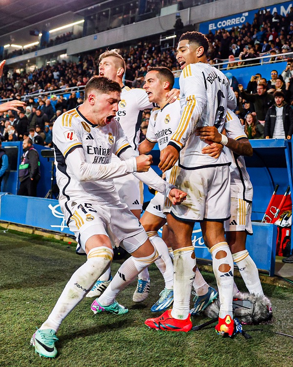 Para pemain Real Madrid merayakan gol kemenangan pada pertandingan Liga Spanyol melawan Alaves yang dimainkan di Stadion Mendizorroza, Vitoria, Kami (21/12/2023). (@realmadriden)