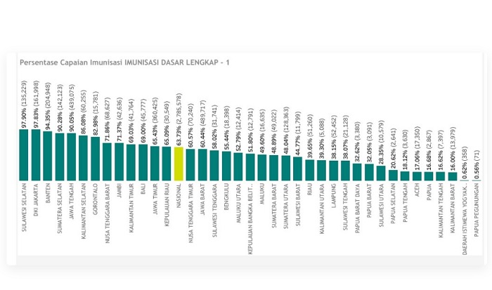 INFOKINI.ID, MAKASSAR – Cakupan Imunisasi Dasar Lengkap (IDL) di Provinsi Sulawesi Selatan tertinggi nasional. Berdasarkan data per 29 Desember 2023, cakupan IDL Sulawesi Selatan mencapai 97,90 persen. Disusul DKI Jakarta 97,83 persen, Banten 94,35 persen, Sumatera Selatan 90,28 persen, dan Jawa Tengah 90,05 persen.