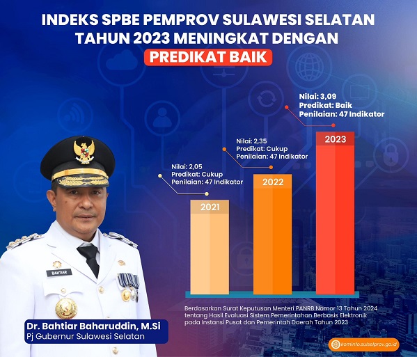 INFOKINI.ID, MAKASSAR – Indeks Sistem Pemerintahan Berbasis Elektronik (SPBE) tahun 2023 Pemerintah Provinsi Sulawesi Selatan mengalami peningkatan. Meraih predikat baik dengan nilai 3,09 poin.