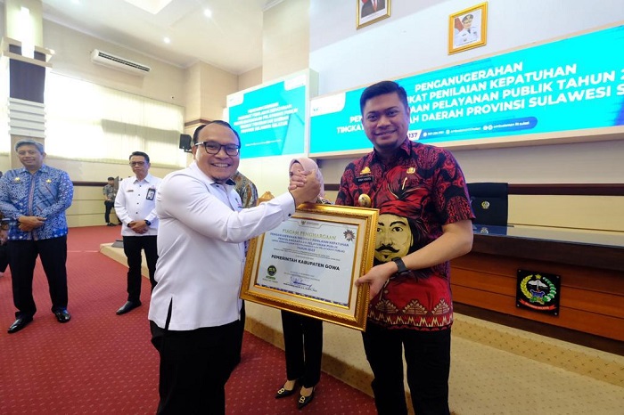 Pemkab Gowa meraih penghargaan terbaik ketiga Penyelenggaraan Pelayanan Publik Tingkat Sulsel. Penghargaan diterima Bupati Gowa Adnan Purichta Ichsan pada Penganugerahan Predikat Penilaian Kepatuhan Penyelenggaraan Pelayanan Publik Tahun 2023 oleh Ombudsman RI, di Ruang Rapat Pimpinan Gubernur Sulsel, Kamis (25/1/2024).