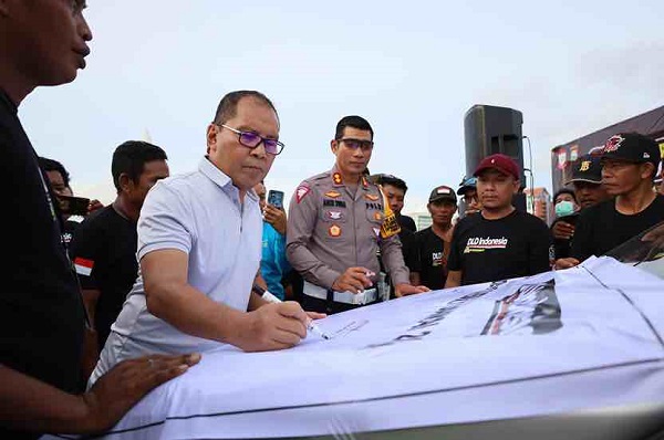 Danny Pomanto bersama Kasatlantas Polrestabes Makassar AKBP Amin Toha dan juga DLD Indonesia menandatangani Deklarasi Pemilu Damai 2024.