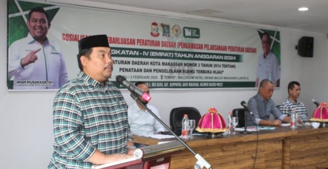 INFOKINI.ID, MAKASSAR– Anggota DPRD Kota Makassar, Imam Musakkar menggelar fungsi pengawasan dalam rangka penyeberluasan peraturan daerah (Perda) Nomor 3 Tahun 2014 tentang Penataan dan Pengelolaan Ruang Terbuka Hijau, di Hotel Grand Maleo, Sabtu (3/2/2024).