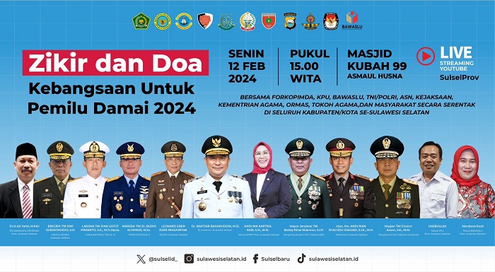“Betul, Zikir dan Doa Kebangsaan untuk Pemilu damai 2024 ada siaran langsungnya di akun youtube Sulselprov, juga Live di RRI pada pukul 15.00 Wita di Mesjid Kubah 99 Asmaul Husna,” kata Kepala Dinas Komunikasi, Informatika, Statistik dan Persandian Sulsel, A. Winarno Eka Putra.
