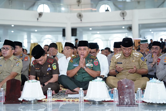 INFOKINI.ID, MAKASSAR – Dalam semangat memperkuat persatuan dan kesatuan menuju Pemilihan Umum (Pemilu) 2024 yang lancar, aman dan damai, Pangdam XIV/Hasanuddin Mayjen TNI Bobby Rinal Makmun, didampingi sejumlah Pejabat Utama (PJU) Kodam, mengikuti Zikir dan Doa Kebangsaan untuk Pemilu Damai 2024, bertempat di Masjid 99 Kubah Asmaul Husna Kawasan CPI Makassar, Jl. H. Bau, Kota Makassar, Senin (12/2/2024).