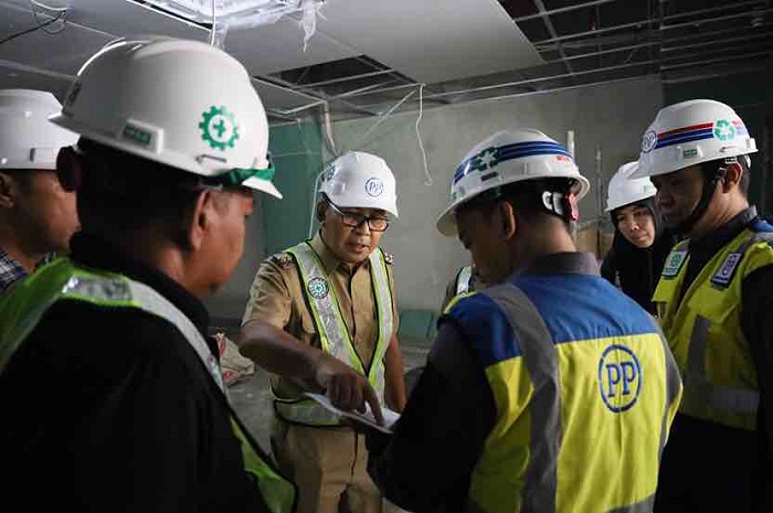 Didampingi Kepala Dinas PU Makassar Zuhaelsi Zubir dan Kepala Bidang Sarana dan Prasarana Hajar Aswad, Danny Pomanto mengecek progres pengerjaan MGC mulai lantai dasar hingga lantai tiga.