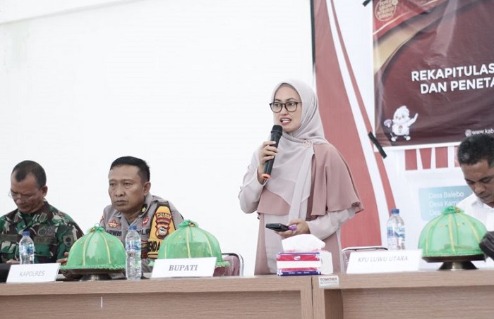 Bupati Luwu Utara, Indah Putri Indriani saat menyampaikan sambutan pada Rapat Pleno Terbuka Hasil Pemilu 2024.
