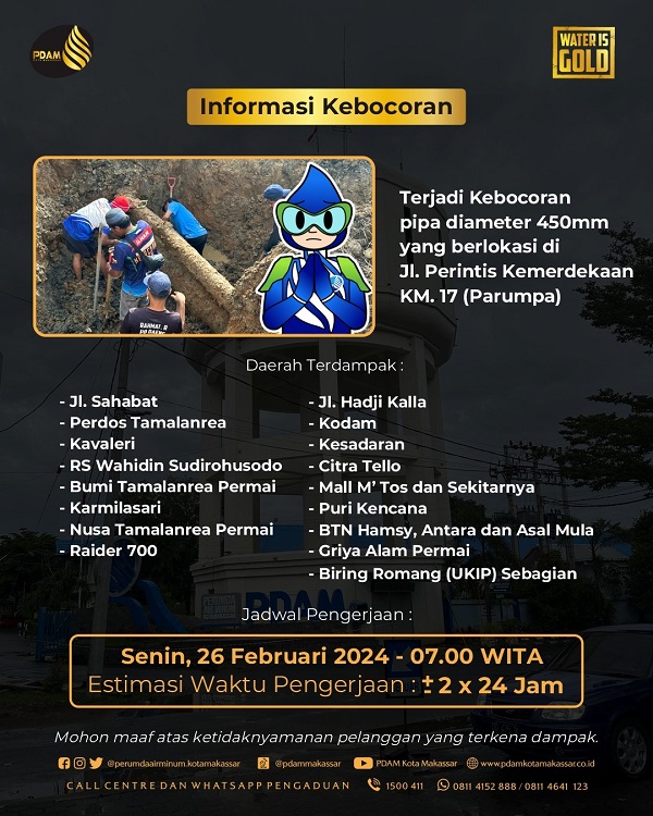 Adapun jadwal pengerjaan perbaikan akan dilakukan PDAM Makassar pada Senin, 26 Februari 2024, dengan estimasi waktu pengerjaan kurang lebih 2×24 jam.