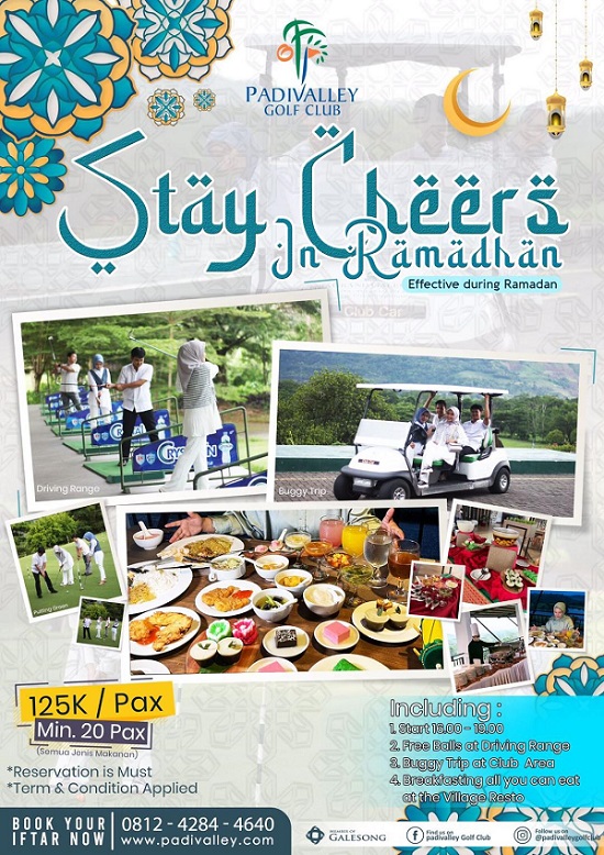 Untuk paket berbuka puasa dengan tema “Stay Cheers In Ramadhan” ini telah include dengan free bermain golf di driving range, free buggy cart area club, dan buka puasa all you can eat di The Village Resto.