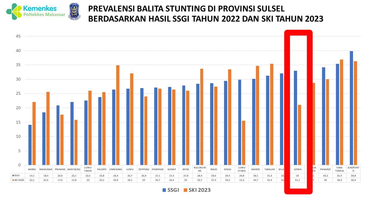 “Ini wujud komitmen Pemkab Gowa. Alhamdulillah, hasil Survei Kesehatan Indonesia (SKI) Tahun 2023 sudah dirilis dari Kementerian Kesehatan RI. Di mana hasilnya menunjukkan bahwa prevalensi stunting di kabupaten Gowa menurun drastis dari 33 persen (tahun 2022) menjadi 21,1 persen (2023). Bahkan kita termasuk penurunan tertinggi kedua setelah Luwu Utara yang turun 14,3 persen. Ini tentunya tidak lepas dari upaya kita semua yang ikut terlibat,” ungkapnya.