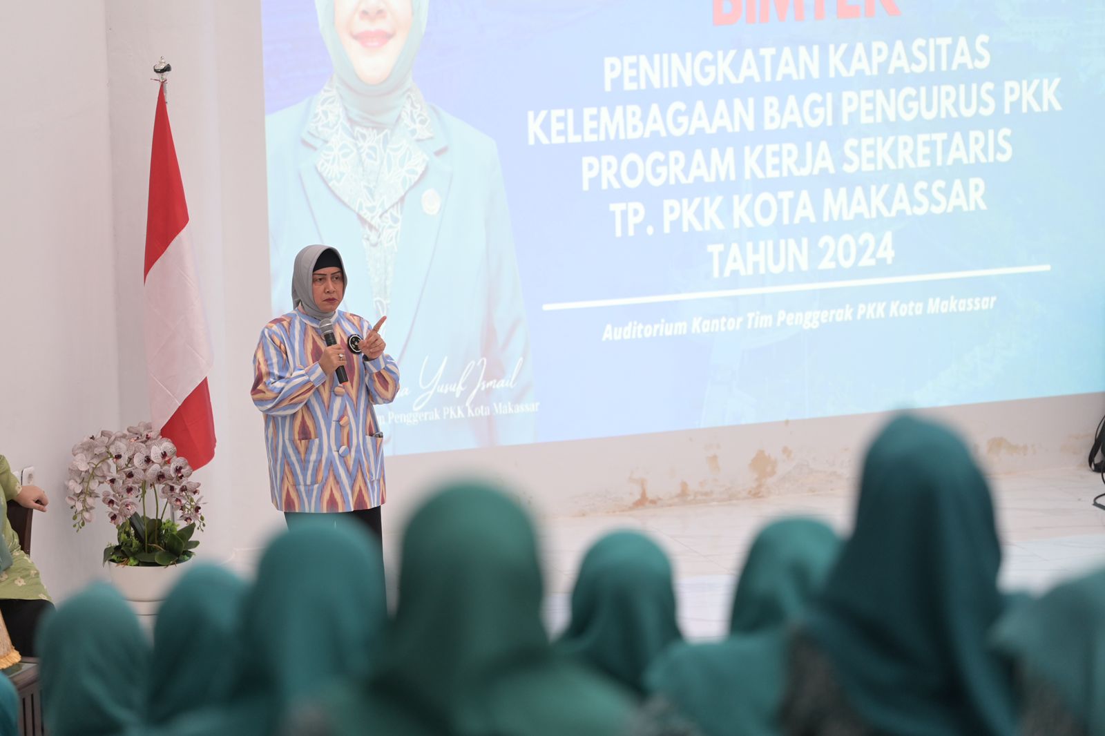 INFOKINI.ID, MAKASSAR – Ketua TP PKK Kota Makassar Indira Yusuf Ismail mendorong semangat kekompakan di sela-sela bimtek pengurus TP PKK Kecamatan Tamalanrea m di Auditorium Kantor TP PKK Kota Makassar, Selasa (30/04/2023). Bimtek akan berlangsung selama 15 hari dan diikuti 93 pengurus.