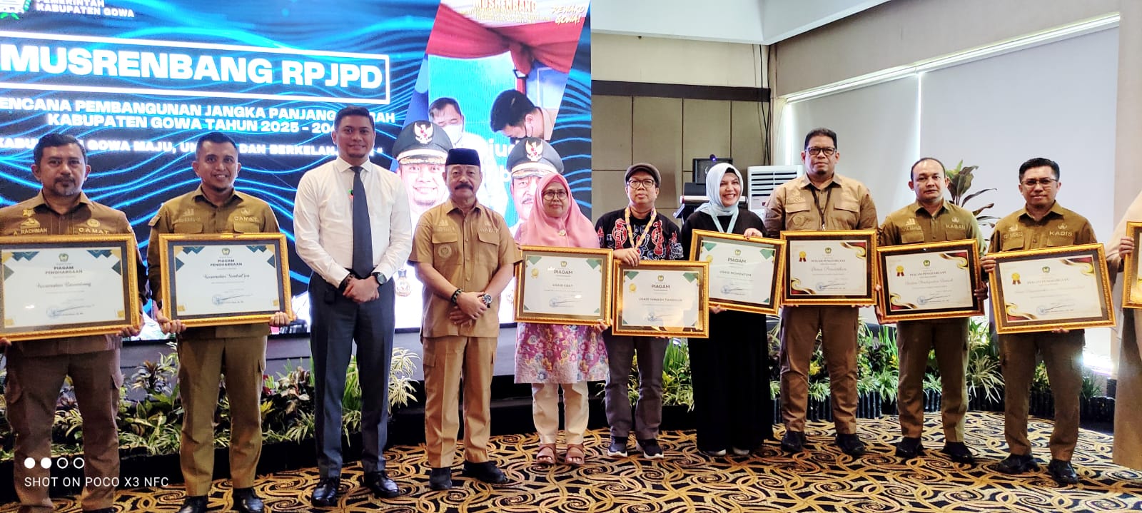 Penerima penghargaan perencana OPD terbaik, kecamatan pelaksana musrenbang terbaik dan apresiasi mitra pembangunan daerah Kabupaten Gowa bersama Bupati dan Wabup Gowa, saat pembukaan Musrenbang RPJPD Kabupaten Gowa Tahun 2025-2045.(Foto:ist)