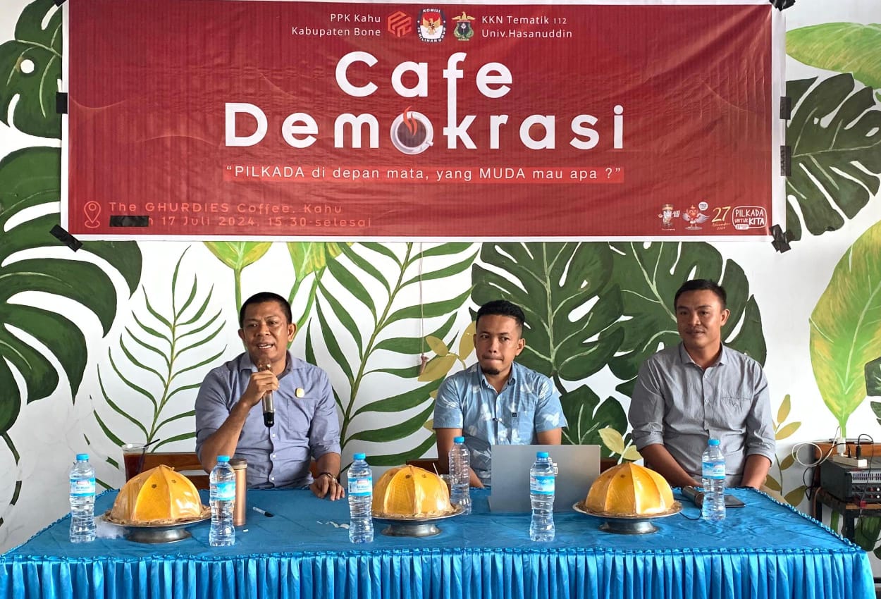 INFOKINI.ID, BONE – Komisi Pemilihan Umum (KPU) Kabupaten Bone melakukan sosialisasi bertajuk Cafe Demokrasi di The Gurdies Coffee, Kecamatan Kahu, Kabupaten Bone, Rabu (17/7/2024). Kegiatan ini dalam rangka meningkatkan partisipasi pemilih di Pilkada 2024.