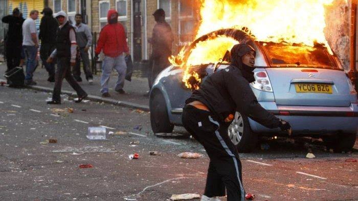 Tayangan televisi terkemuka Inggris, BBC, menunjukkan gerombolan massa yang terdiri atas ratusan orang mengamuk di pusat kota Sunderland, melakukan aksi penyerangan terhadap polisi-polisi yang ada di lokasi dan membakar setidaknya satu mobil serta sebuah gedung yang terletak di sebelah kantor polisi setempat.