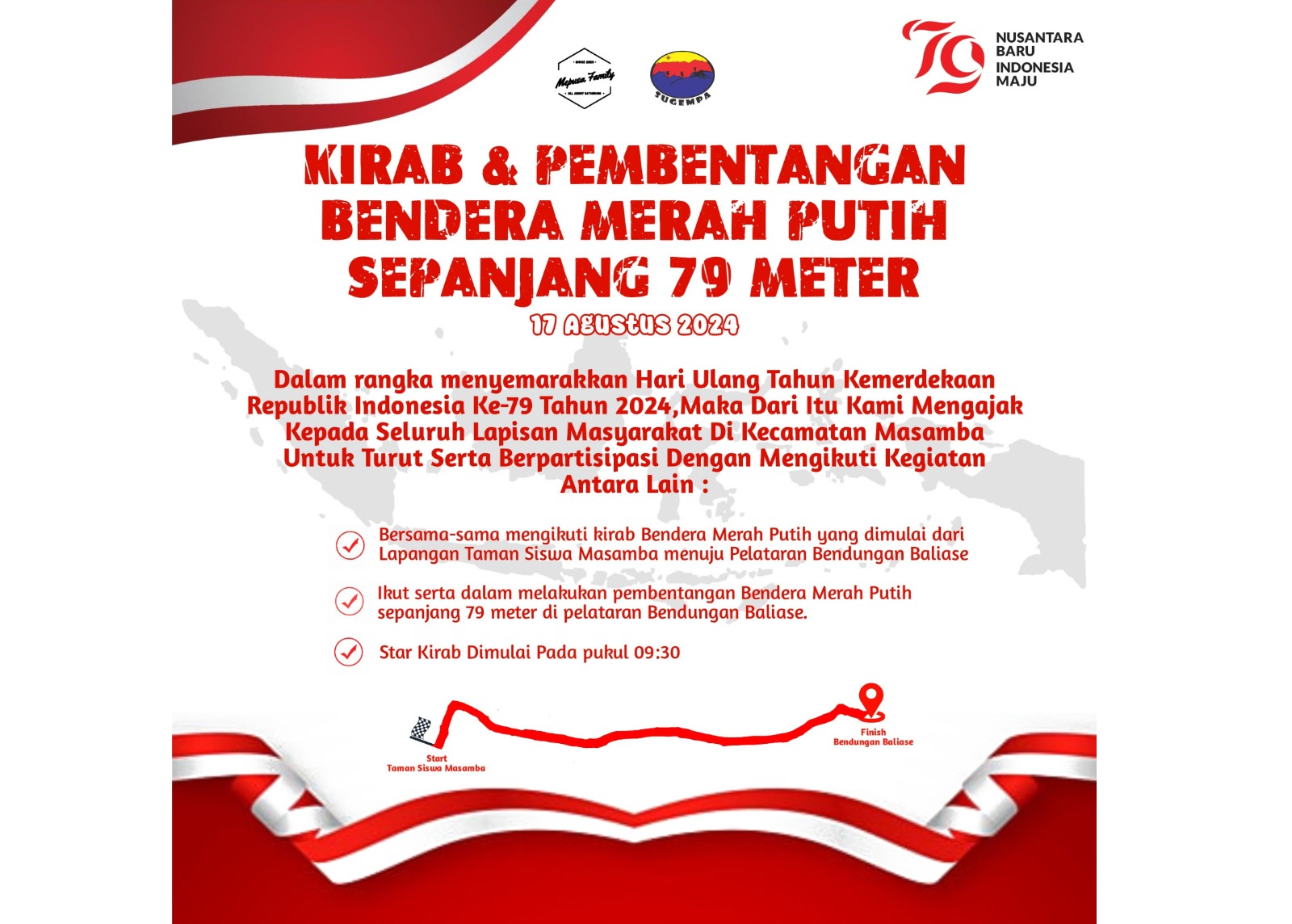 INFOKINI.ID, LUTRA – Dalam rangka memperingati Hari Ulang Tahun (HUT) ke-79 Republik Indonesia (RI), Keluarga Besar MEPUSA dan LPPA SUGEMPA bersama Komunitas Pencinta Alam (KPA) Luwu Utara akan melaksanakan kegiatan kirab dan pengibaran bendera merah putih sepanjang 79 meter. Kegiatan ini rencananya akan dilepas Bupati Indah Putri Indriani usai Upacara Peringatan ke-79 detik-detik Proklamasi Kemerdekaan Indonesia di Lapangan Tamsis Masamba.