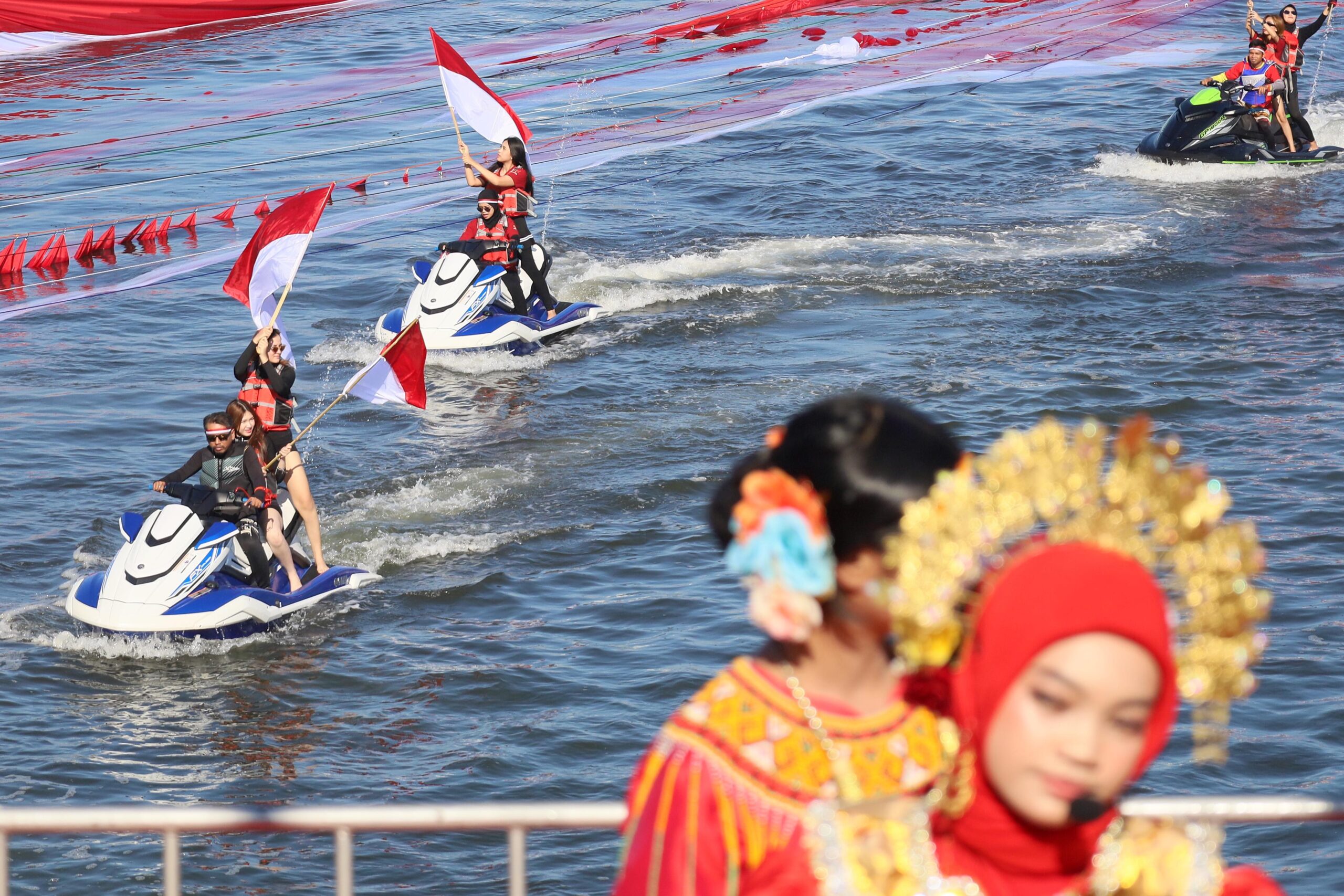 Tak ketinggalan, atraksi jetski dan flyboard yang membawa bendera merah putih berkibar di udara menambah semarak perayaan.