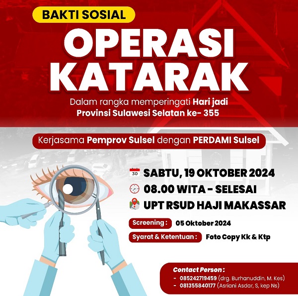 Direktur RSUD Haji Makassar, dr Evi Mustikawati Arifin mengatakan, dalam rangka memperingati hari jadi Sulawesi Selatan, pihaknya bekerjasama dengan Persatuan Dokter Mata Indonesia (Perdami) Sulawesi Selatan akan mengadakan bakti sosial Operasi Katarak pada 19 Oktober nanti di UPT RSUD Haji Makassar.