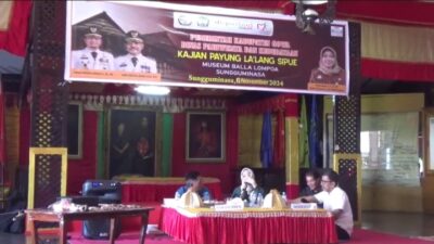 INFOKINI.ID, GOWA– Dinas Pariwisata dan Kabudayaan (Disparbud) Kabupaten Gowa menggelar seminar koleksi dan budaya di Museum Balla Lompoa. Seminar benda koleksi yang ada di Museum Balla Lompoa ini menjadi bagian rangkaian peringatan Hari Jadi Kabupaten Gowa Ke-704 tahun 2024 ini. Salah satu benda koleksi yang disemnarkan adalah Payung La’lang Sipue, yang merupakan payung adat yang khusus digunakan saat pelantikan para raja. Seminar yang dihadirkan Disparbud Gowa ini bertujuan untuk mencari data, informasi dan narasi sebanyak-banyaknya yang valid tentang sejarah koleksi, khususnya terkait Kerajaan Gowa yang ada di Museum Balla Lompoa. Budayawan dan peneliti budaya juga dihadirkan dalam seminar ini.