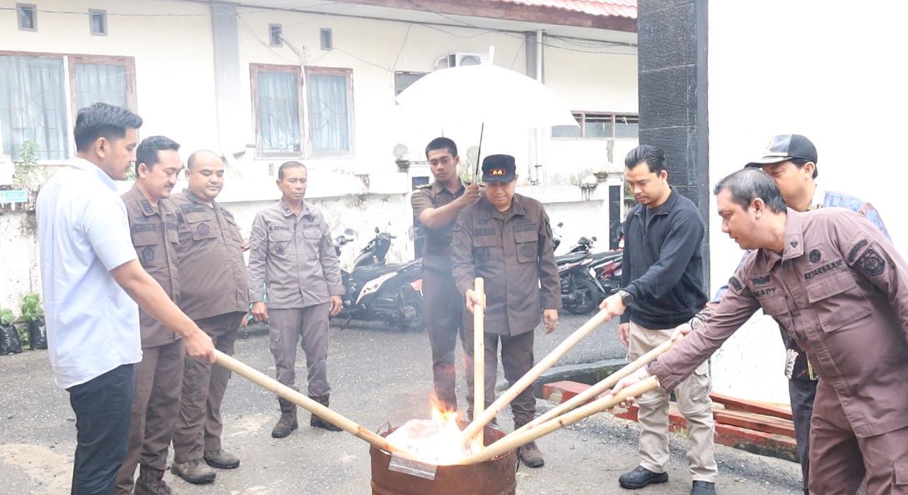 Pemusnahan barang bukti dilakukan di Kantor Kejari Wajo. Hadir Ketua Pengadilan Negeri Sengkang Ilham dan Kasat Narkoba Polres Wajo AKP Prawira Wardany.