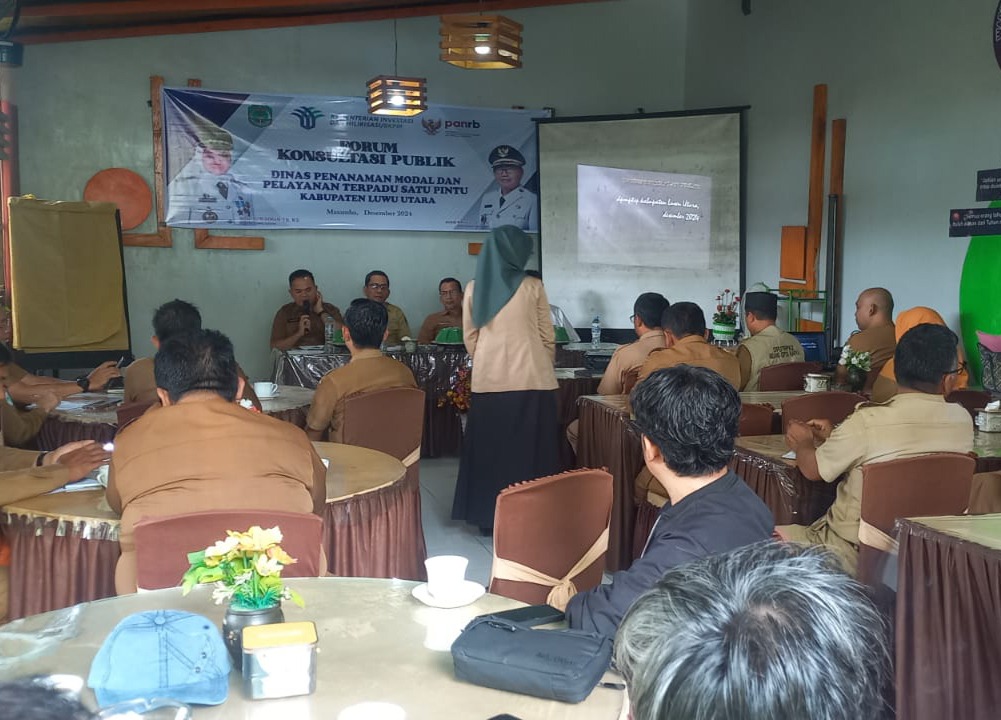 INFOKINI.ID, LUTRA – Dinas Penanaman Modal dan Pelayanan Terpadu Satu Pintu (DPMPTSP) Kabupaten Luwu Utara menggelar Forum Komunikasi Masyarakat dan Forum Konsultasi Publik (FKM-FKP), Senin (23/12/2024). Konsultasi berlangsung di Aula Pertemuan Warkop Daeng Azis, Masamba.
