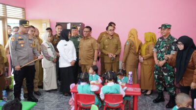 INFOKINI.ID, GOWA– Program Makanan Bergizi Gratis (MBG) di wilayah Kabupaten Gowa mulai diujicobakan, Senin (13/1/2025) di Kecamatan Somba Opu, Kabupaten Gowa. Sekda Kabupaten Gowa, Andi Azis Peter bersama Dandim 1409/Gowa Letkol Inf Heri Kuswanto, Kapolres Gowa AKBP Reonald T. Simanjuntak dan pejabat SKPD Kabupaten Gowa meninjau langsung ujicoba di sejumlah sekolah di Kecamatan Somba Opu, diantaranya di SD Inpres Katangka, TK Kartika Jaya XX-34 Kodim Gowa, dan SMP Negeri 4 Gowa.