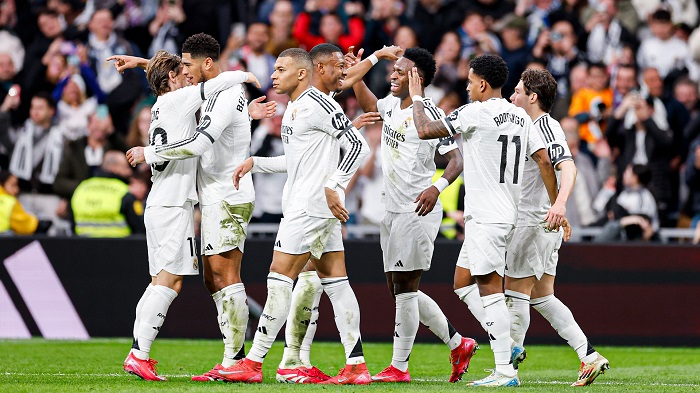 Para pemain Real Madrid merayakan gol yang dicetak Vinicius Junior ke gawang Rayo Vallecano dalam laga lanjutan Liga Spanyol di Stasion Santiago Bernabeu, Madrid, Minggu malam WIB (9/3/2025). (Foto: X/@realmadriden)