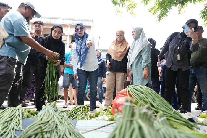 Bupati Gowa, Sitti Husniah Talenrang meninjau harga bahan pokok jelang Hari Raya Idul Fitri 1446 Hijriah di Pasar Minasamaupa, Sungguminasa, Sabtu (29/3).