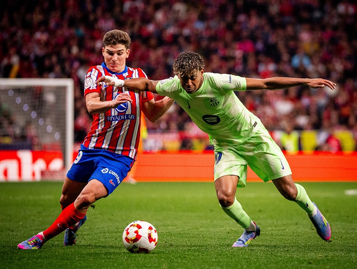 Pemain Barcelona Lamine Yamal berebut bola dengan pemain Atletico Madrid. Barcelona berhasil lolos ke final Copa del Rey setelah berhasil mengalahkan Atletico Madrid 1-0 pada leg kedua semifinal di Stadion Riyadh Air Metropolitano, Kamis dini hari WIB (3/4/2025). (Foto: X/@FCBarcelona)