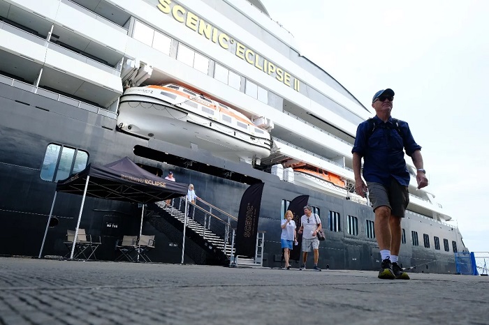 INFOKINI.ID, MAKASSAR – Kapal pesiar ekspedisi raksasa, Scenic Eclipse II, bersandar di Pelabuhan Soekarno-Hatta, Makassar, Selasa (8/4/2025). Kapal ini sebelumnya melakukan kunjungan ke Palopo, Sulawesi Selatan.