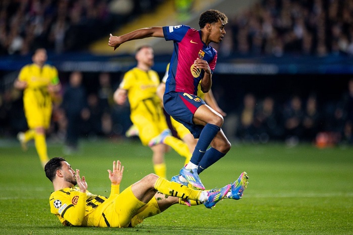 Pemain Barcelona Lamine Yamal melewati hadangan pemain Borussia Dortmund pada leg pertama perempat final Liga Champions 2024/25, Kamis (10/4) WIB. Barcelona menang besar 4-0. (Foto: X/@FCBarcelona)