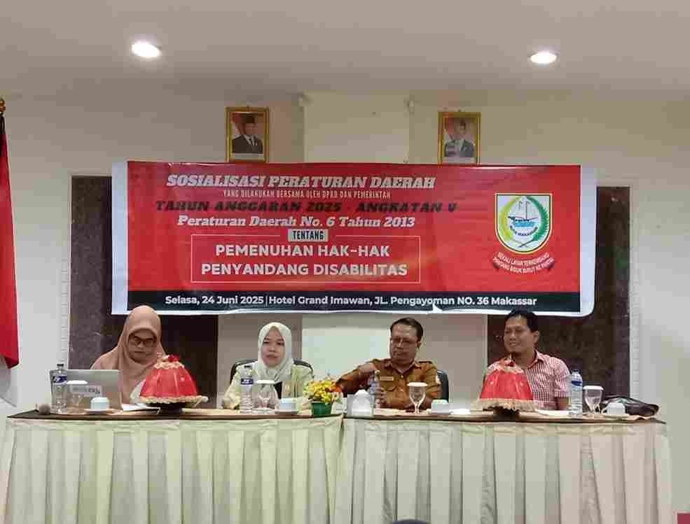 INFOKINI.ID, MAKASSAR–Dalam rangka memperluas pemahaman masyarakat mengenai hak-hak penyandang disabilitas, Anggota DPRD Kota Makassar, Rezeki Nur, S.Kep., M.Kep., menggelar sosialisasi Peraturan Daerah Nomor 6 Tahun 2013 tentang Pemenuhan Hak-Hak Penyandang Disabilitas di Hotel Grand Imawan Makassar, Jl. Pengayoman No. 36.