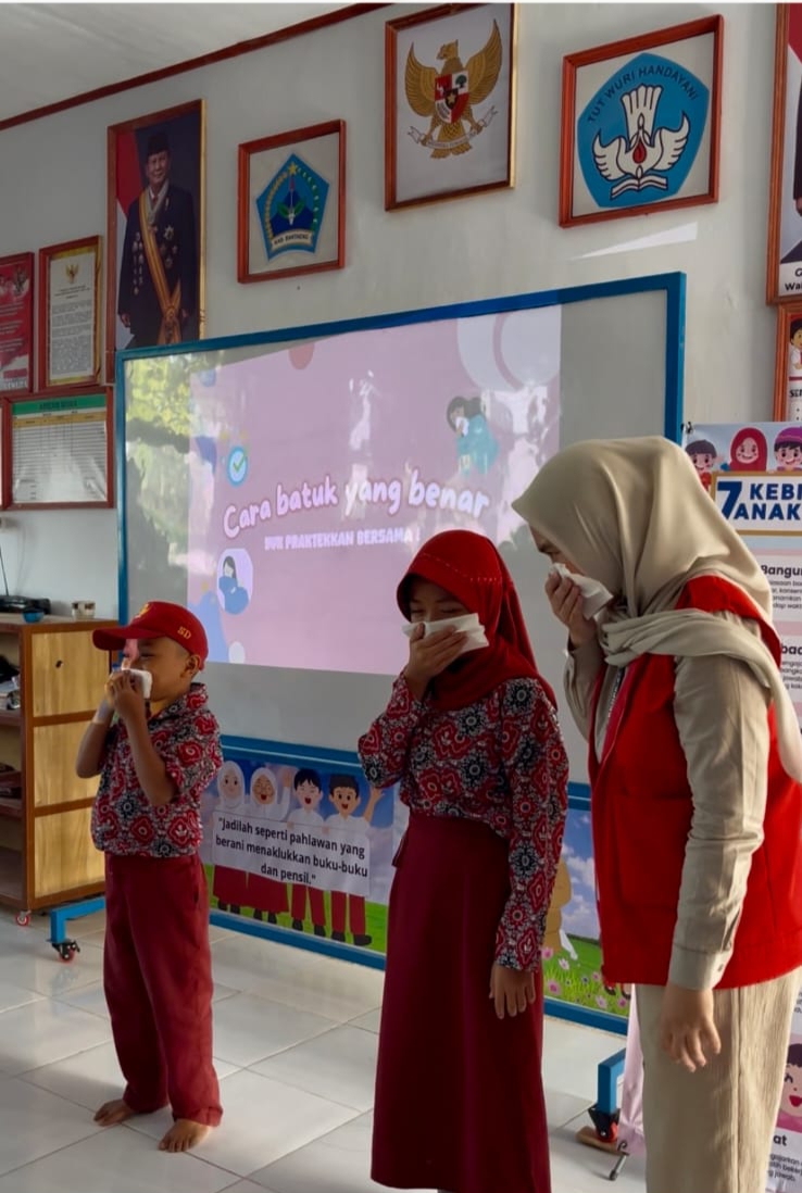 Salah satu bagian penting dalam penyuluhan ini adalah demonstrasi dan praktik langsung mengenai etika batuk dan bersin yang benar, yaitu dengan menutup mulut menggunakan siku bagian dalam atau tisu, serta pentingnya mencuci tangan setelahnya. Praktik ini dilakukan bersama seluruh siswa untuk memastikan mereka memahami dan mampu menerapkannya secara mandiri.